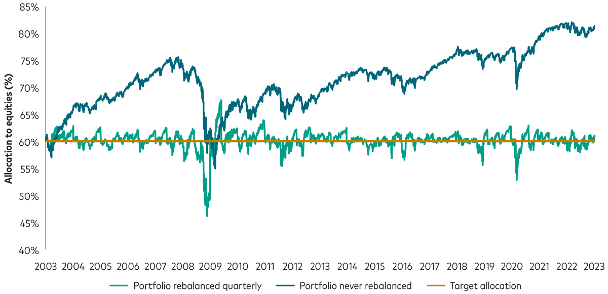 For example, a portfolio with an asset allocation of 60% global equities and 40% global bonds at the end of 2003, if never rebalanced, would have had 80% in equities at the end of 2022, as shown in the chart below. In contrast, an identical portfolio that was rebalanced at the end of each quarter would have maintained the target allocation and the desired risk profile over time.
