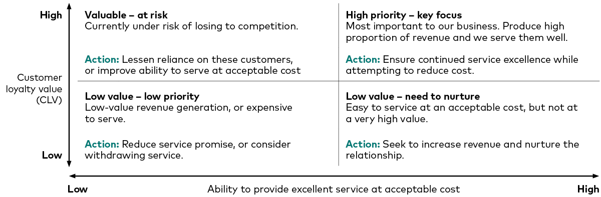 Low service at an acceptable cost / high value = need to nurture: these clients are also valuable, but they may not wish to pay for the highest level of service. Look for ways to provide cost-effective solutions that will still meet their needs.