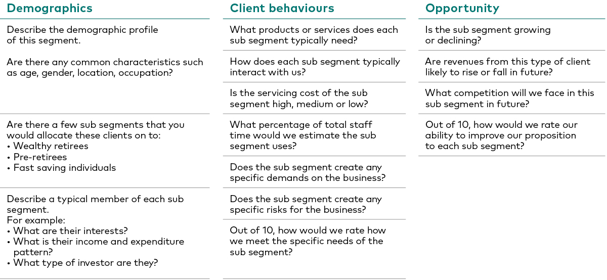 There are numerous approaches to profiling the segmentation of your client base. Many companies will assist a firm with understanding these client profiles, using a data-modelling approach. But before you dive into the data, consider first the question you are trying to answer from undertaking this exercise as this may help to inform the approach you take: