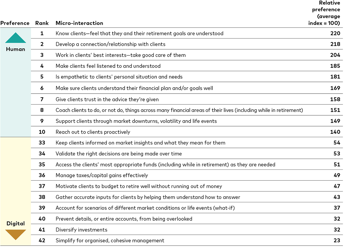 Notes: In this figure, all 1,518 clients answered the question. They were presented with four micro-interactions / relative-preference scores at a time, 12 times in different screens, and asked which they most preferred to be delivered by a human or digital service so that we could rank each micro-interaction as well as relative preferences. The statistical technique used to calculate the rank and relative preference scores is called MaxDiff. The relative-preference score should be interpreted as follows. Take the micro-interactions ranked #8—“Coach clients to do, or not do, things across many financial areas of their lives (including while in retirement),” and #36—“Manage taxes/capital gains effectively,” for example. Their relative-preference scores are 158 and 49. This means that investors prefer that micro-interaction #8 be delivered by a human 3.2 times (158 divided by 49) more than micro-interaction #36.